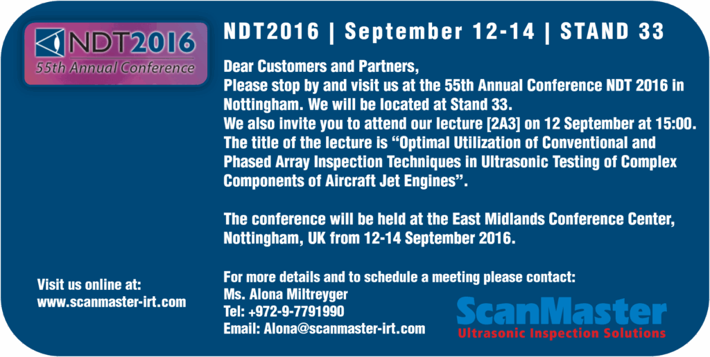 Dear Customers and Partners, Please stop by and visit us at the 55th Annual Conference NDT 2016 in Nottingham. We will be located at Stand 33