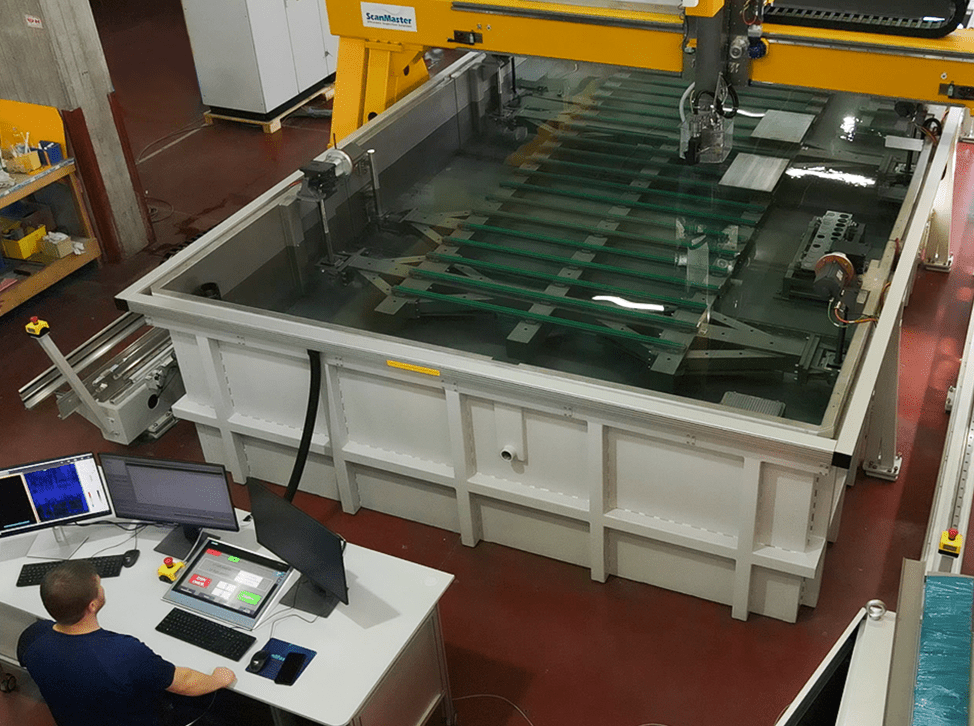 The system inspects and evaluates small size defects in thick Titanium plates. The immersion ultrasonic testing is done using a combination of Phased array and conventional UT.