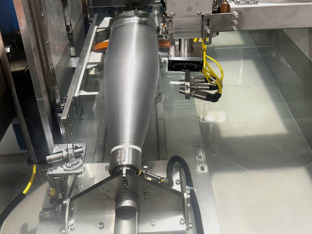 Automated ultrasonic inspection of projectiles and artillery shells, ensures structural integrity and reliability by detecting internal flaws.